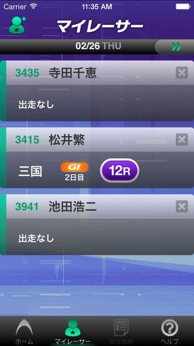 気になる選手は最大で15人までマイレーサーに登録することができ、出走レースが一覧で表示されるので、タップするとレース前であれば出走表、終了していれば結果を見ることができます。