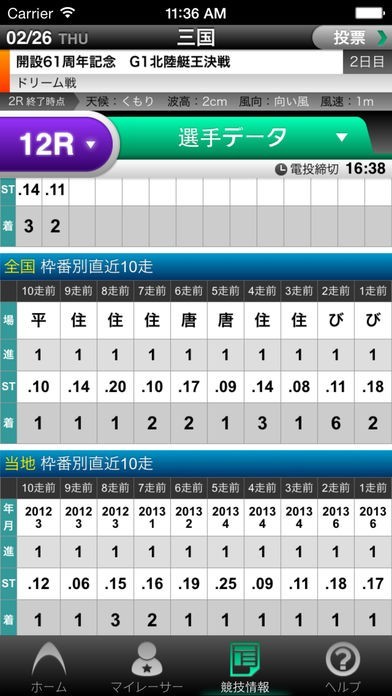 予想する上で重要になってくる選手データは枠番別の直近10走やボートレース場との相性、優勝回数など詳しく載っていて、タップなど簡単な操作でスムーズに閲覧できます。