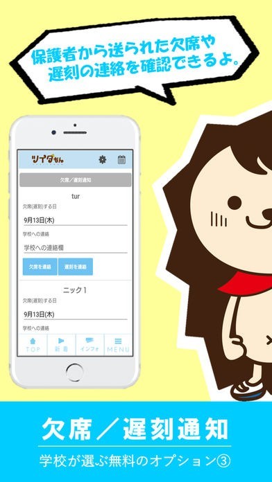 体調が悪いなどのトラブルが子供に起こった時は、学校に欠席や遅刻を速やかに伝えることができます。学校側も手軽に生徒の欠席や遅刻を把握することができるのでスムーズに対応できます。