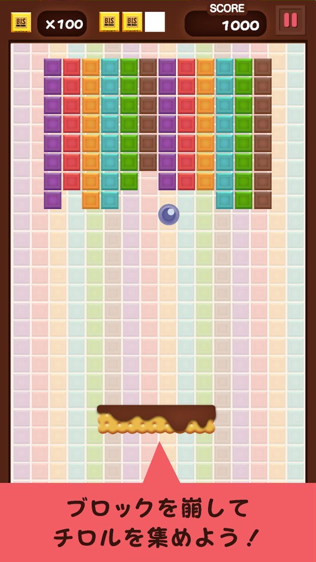 あのチロルチョコのブロック崩しゲームです。 内容はシンプルなブロック崩しゲームなのですが、背景やブロックはチロルチョコを彷彿とさせるカラフルでポップなデザイン。特に土台はビスケットにチョコレートが掛かったデザインで、甘いもの好きにはたまらない世界観です。 ブロック崩しのステージ数は100以上もあり、長く遊ぶことができます。さらにブロック崩しで集めたチロルは、チロルチョコの限定壁紙などの貴重なアイテムと交換することができます。