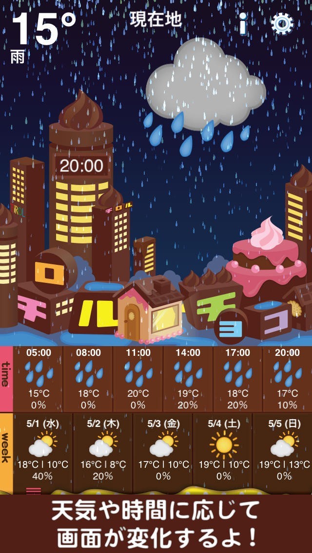 日本で長く人気を誇っているチョコレート菓子、チロルチョコとコラボして作られた天気予報アプリです。GPS機能があるので今いる場所の天気を簡単に知ることが出来ます。3時間ごとの天気が絵文字で表示されているので一目でその日の様子が分かります。同じページで週間天気も見れるので便利です。画面は絵本のような可愛いイラストが特徴的で、時間や天気によってデザインに変化があるので毎日アプリを開くのが楽しくなります。また、簡単なミニゲームも出来るため小さなお子さんに遊ばせるのにも向いています。