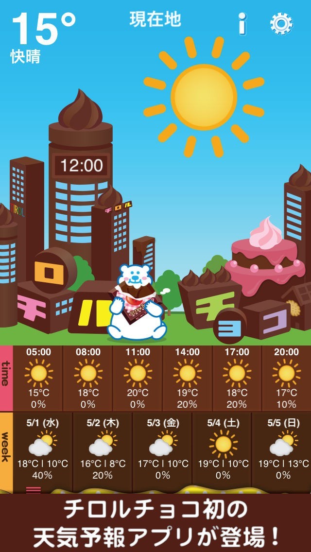 チロルチョコの世界観が楽しめるお天気アプリ可愛い雰囲気でチロルチョコのキャラクターも登場