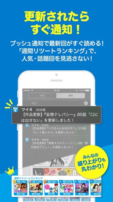 毎日無料で漫画を楽しみたいならばツイ4です。ツイ4では毎日更新される4コマ漫画を全て、無料で読むことができます。最新作だけということもなく過去のお話も全て読めてしまいます。さらに通知許可しておけばチェックしておいた作品が更新されるたびに教えてくれる機能もあります。ランキングでは人気作品が一目でわかり面白い作品を見逃してしまうということもありません。さらにTwitter連携をしておけばアプリ内からリツイートすることで作者を直接応援することもできるようになっているマンガアプリです。