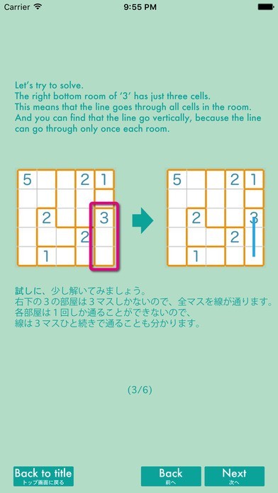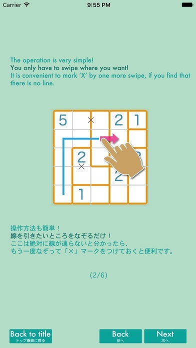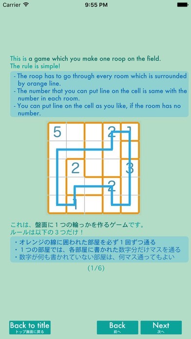 「カントリーロード」は表示された画面をルールに従って始点と終点を一筆書きに繋ぐパズルゲームのアプリです。濃い線に囲まれた部屋の中に書いてある数字の数のマス目を通らなければなりません。また、濃い線に囲まれた部屋は必ず一度は通らなければなりません。ルールはシンプルですので、何回かプレイすると十分に理解ができて楽しめるようになります。できた時の達成感より、できなかった時の方が悔しくて思った以上にやりこんでしまうので注意しましょう。