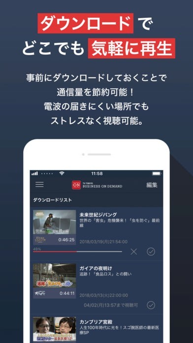 「テレビ東京ビジネスオンデマンド」は、テレビ東京で放送された報道番組がいつでも見られるアプリです。 リアルタイムで見逃してしまっても、国内はもちろん、世界の株や為替、政治ニュース、経済ニュースに関わる舞台裏のドキュメンタリーなど、経済の最新情報をインターネットでチェックすることができます。 番組は毎日更新されるので、旬な情報を逃しません! 番組はダウンロードができるので、電車の中や地下でも場所を選ぶことなく、どこでもオフラインで視聴することができます。