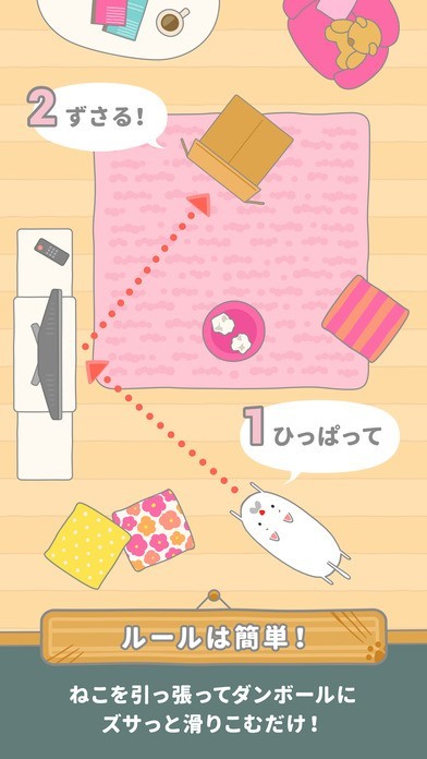 猫を引張ってダンボールにショットインさせる癒し系ゲームアプリ