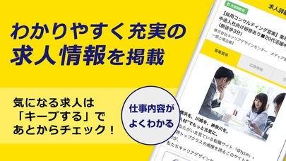 様々な求人情報が掲載されていて、業種等の条件から自分に合わせた仕事が検索出来るようになっています。キープリストに気になる求人をまとめて保管出来るのも利点でしょう。
