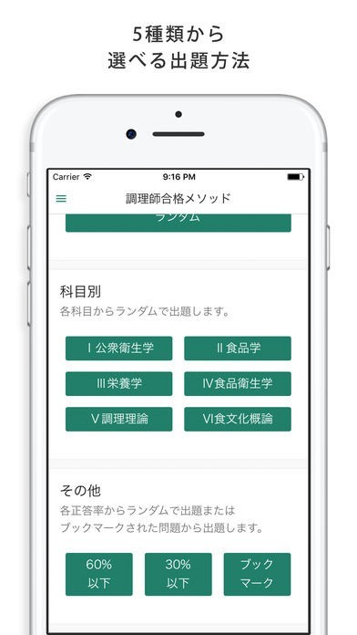 実際の試験と同じ方式のほかランダムに出題したり、科目別に出題したりと様々な出題方法が用意されているので、習熟度や自分の好みに合わせて問題を解いていくことができます。