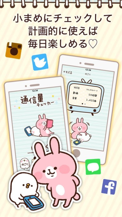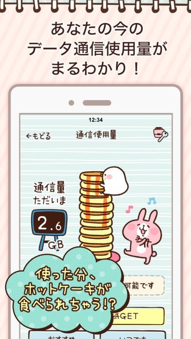 データ通信量は気になるけど、ただのアプリじゃつまらないし、続かない・・・そんなあなたにおすすめです! カナヘイの通信量チェッカーならピスケ&うさぎと一緒に簡単に通信量を確認することができます。 2匹のことが大好き!というあなたはもちろん、可愛いものは好きだけどこの2匹のことは良くわからないという人も使ってみたら癒されること間違いなしです。