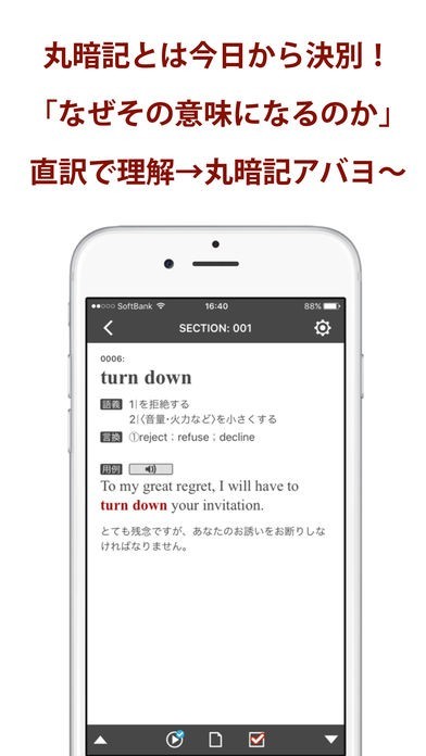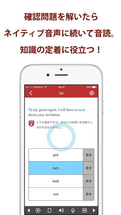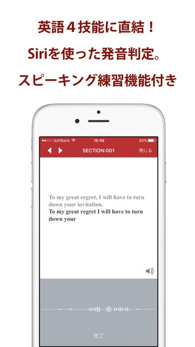 全ての英熟語にはネイティブな音声が収録されているのでリスニング強化も可能です。また、Siriを使って英語で話しかけることで、発音が正しいかどうかを判定してくれる機能も搭載されています。