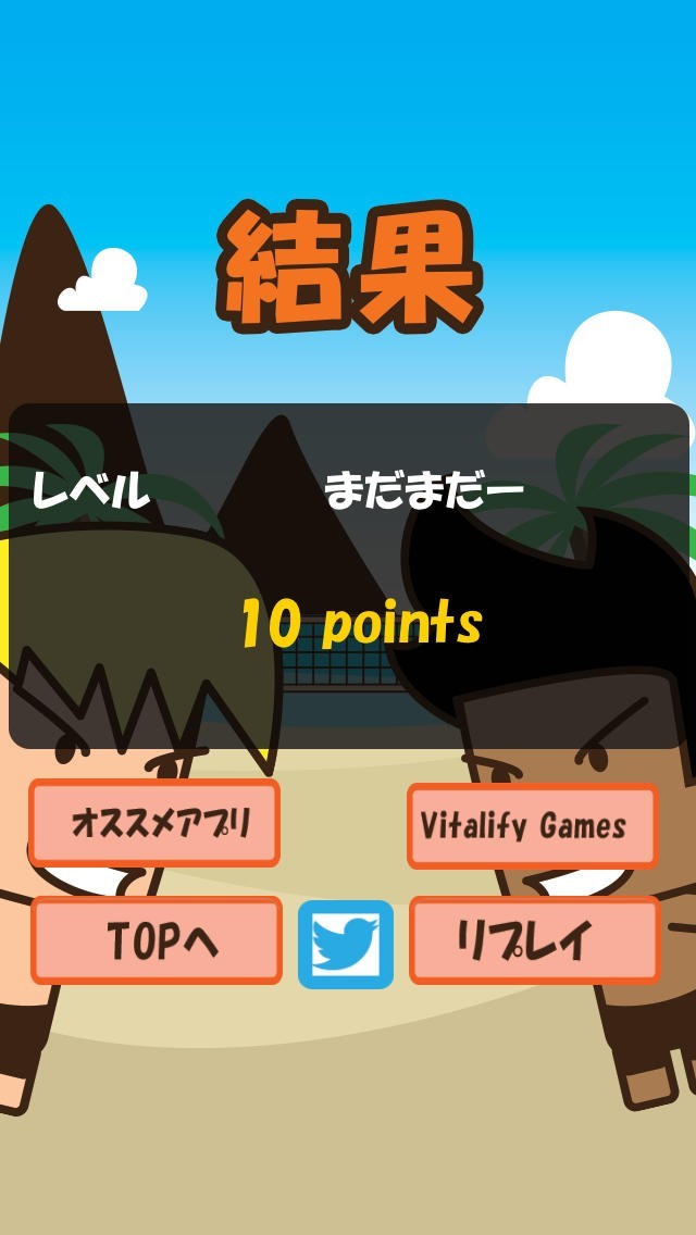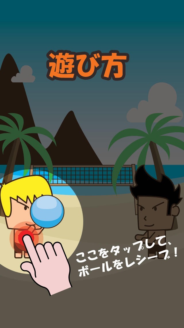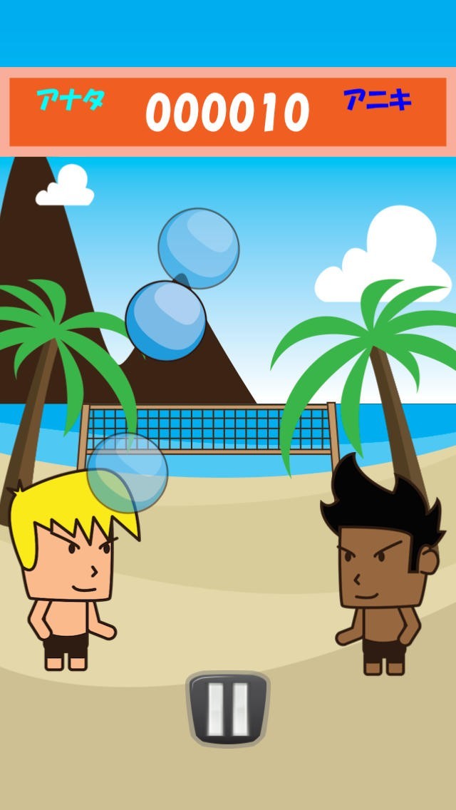 「ビーチバレー兄貴っ!ラリー」は、タップするタイミングでビーチバレーのラリーを続けていく、エンドレスゲームです。 左側に金髪の「兄貴」がおり、プレイヤーはこちら側を操作してラリーを続けます。右側の「黒兄貴」がボールを投げてゲームスタートです。 兄貴の近くにビーチボールが落ちてきた時にタップしてください。兄貴の上に「今タップ!」と赤字で表示されるので、わかりやすいです。 ラリーを続けていくと、黒兄貴は残像付きのボールを投げてきたり、極端に速度を落としたりとトリッキーなボールを投げてきます。 ボールを落としてしまうとゲームオーバーです。