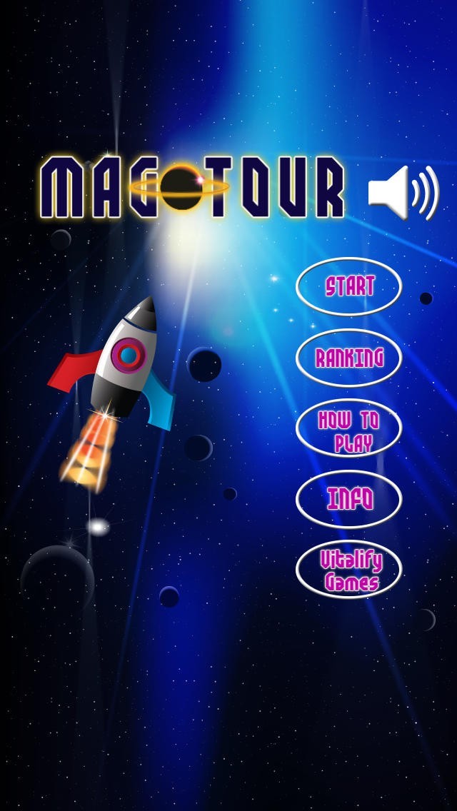 「MAG TOUR」は、磁気がコロコロ変わる宇宙空間の中を、宇宙船で進んで行くゲームアプリになっております。タッチ操作で左右に移動できますが、途中磁気が変わるので、上手く対応する必要があります。障害物に衝突すると、その時点でゲームオーバーになるので注意が必要です。障害物は避けてもいいですし、左のボタンでミサイルを撃ち破壊しても構いません。判断力が重要になってきますが、磁気に対応しながら進めるといつの間にかハマってしまうこと間違いなしです。