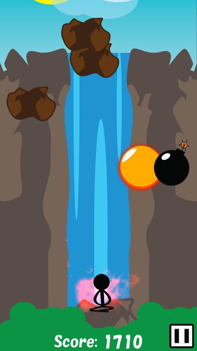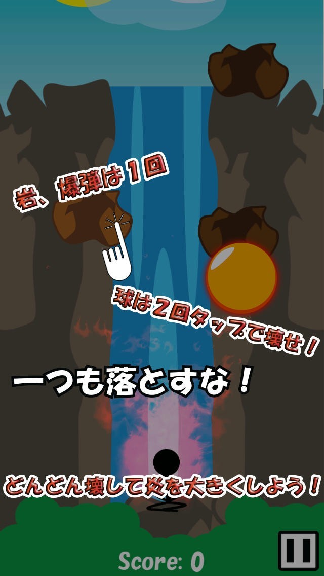 武者修行のために滝に打たれている主人公の頭上から様々な物が落下してきます。落下物を次々と破壊して集中力を高め、己の極限に挑んでいくというシンプルなゲームです。落下物をタップすることで簡単に破壊することができますが、破壊すればするほど落下してくる量が多くなり、難易度が上がっていきます。岩や爆弾などの他に1度のタップでは消すことができない金の玉も降ってきます。これは2度タップしなければ消すことができず手間がかかりますが、ボーナスポイントが加算されるので積極的に破壊していきましょう。また爆弾を破壊すると爆風によって他の落下物を巻き込むことができるので、上手く利用して一気に破壊していきましょう。