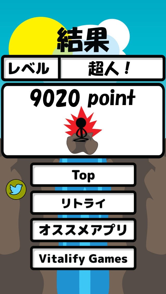 タップ操作で岩や球を破壊していく「武者修行」はランキングで世界中のプレイヤーと競う事が出来るカジュアルゲームで、落ちてくる物に合わせてタップ回数を変えていく仕様になっています。ハイスコアが画面下に更新されていくのでドキドキ感を感じながらプレイする事が可能ですし、結果に合わせて称号を獲得出来るのが大きな特長でしょう。破壊を続けていく事で棒人間にまとっている炎も大きくなります。またTwitterにスコアを共有出来るのもアプリの利点となっています。