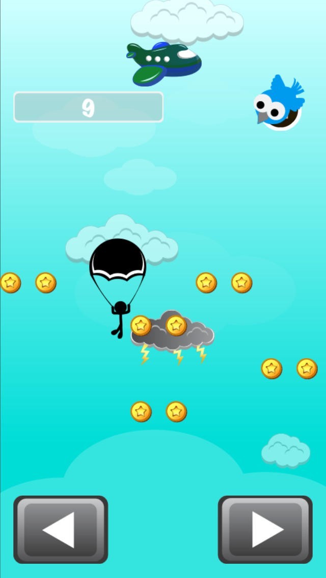 「スカイダイバー」はパラシュートで落下しながら画面上に存在しているコインを上手にゲットしてポイントを稼ぐアクションゲームアプリです。主人公である棒人間を左右のボタンをタップすることで上手に誘導しながらコインに触れるように操作するだけでなく、空を飛んでくる鳥や飛行機などの障害物もかわしながら降りていく必要があります。途中でスペシャルアイテムに触れることが出来れば一定時間内は無敵状態になることが出来るので障害物を気にしないでコインを集めることが出来るようになります。たくさんコインを集めて高得点をゲットしたらSNSで結果をシェアすることも可能です。