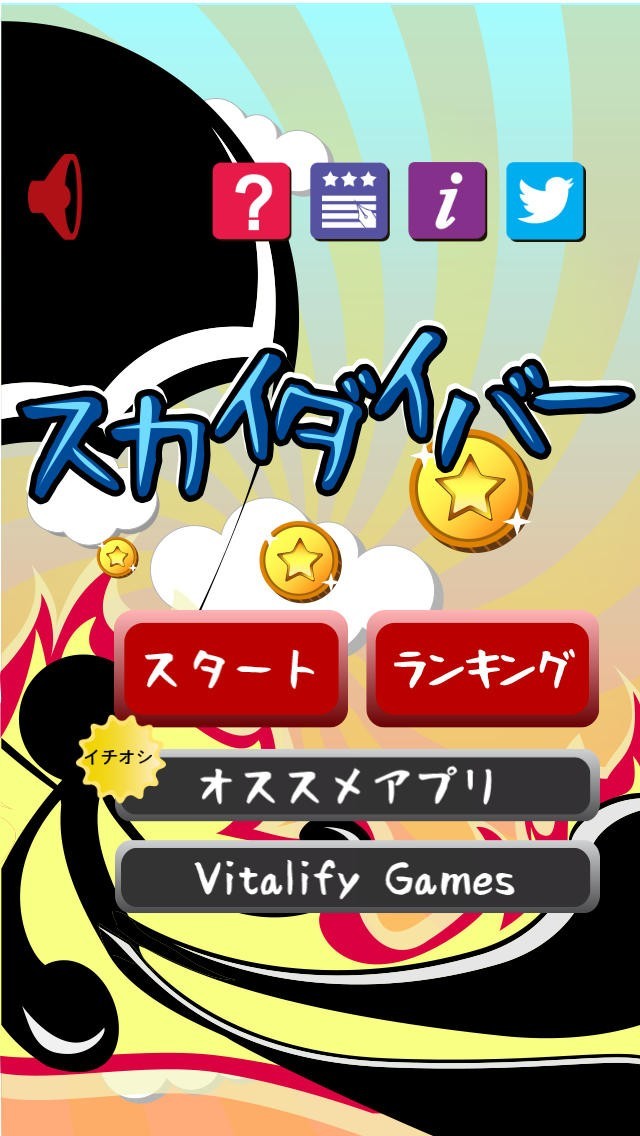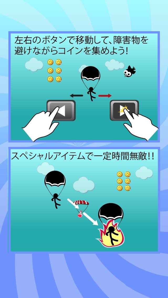 "スカイダイバー"は、人気の棒人間シリーズで、空に浮かんでいるコインを獲得し枚数を競うゲームで、ランキング機能も搭載しており、棒人間シリーズが好きな方で、落下系のプレイを楽しみたい方には見逃せないアプリです。ゲーム攻略のポイントは、コイン獲得だけに集中してしまうと、障害物に当たって即ゲームオーバーになる為、全体を見渡しながら左右の操作で上手く移動するのが鍵となってきます。また、プレイ中に時折出現する紅白のパラシュートをゲットすると、一定時間は無敵になる事ができ障害物を気にせずにコイン獲得ができるので、積極的に紅白のパラシュートをゲットして高得点を狙いましょう。