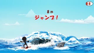 波乗りジョージは、棒人間がサーフィンをしているとサメがたくさん出てくるのでジャンプで飛び越える