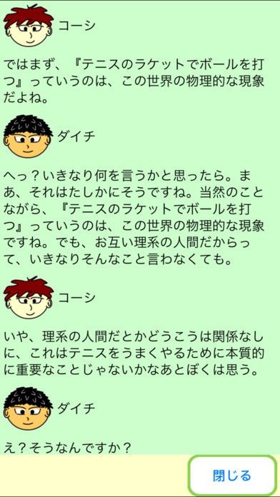 アプリの形式は、大学のテニス部に入っている「ダイチ」と、そのテニス部のOBの「コーシ」の、会話を読んでいく形になっています。