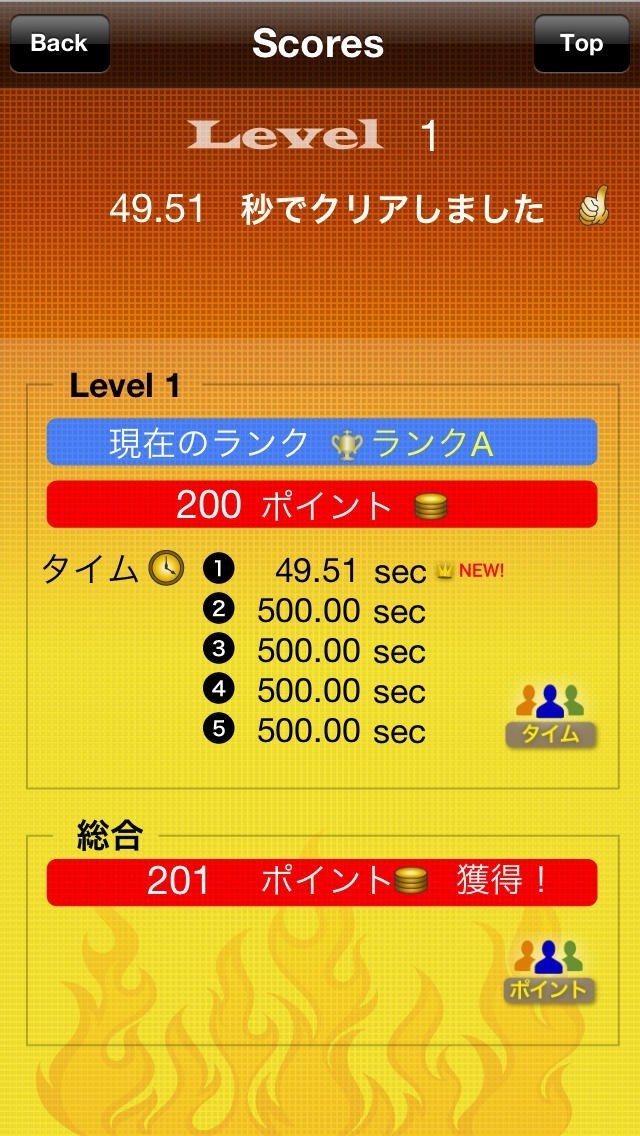 レベルおよびクリア時間に応じてA〜Cのランクとポイントが与えられます。