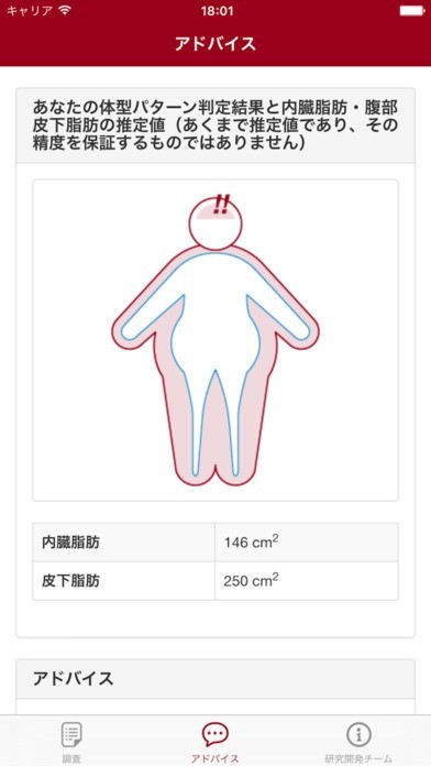 日本人の体の特性や生活習慣を調べるために開発された調査アプリが「メタボウォッチ」です。基本情報や身体測定、生活習慣などを入力することでデータが収集できるようになっていますが、データ収集に参加するユーザー側としても自分の体のことについて、いろいろなことを気づかせてもらうことが出来るアプリとなっています。内臓脂肪や皮下脂肪の状態をグラフィックで表示することで分かりやすくしてくれるだけでなく、アドバイスも貰うことが出来ます。