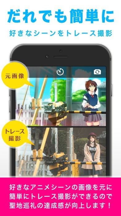 App Storeより引用全国2000万人のアニメファン、キャラクターファンのみなさまに贈る、聖地巡礼必携カメラアプリ!