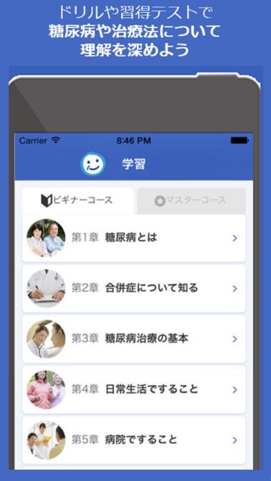 タイプ判定によりご自身の糖尿病治療への向き合い方を知り、学習機能により糖尿病や治療法について理解を深めることができます。また、体重や血圧、食事や運動など毎日の取り組みの記録や、病院で測定した検査値を記録できます。