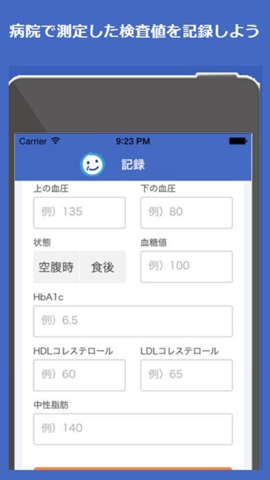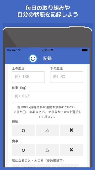 毎日の取り組みや自分の状態、病院で測定した検査値を記録できます。