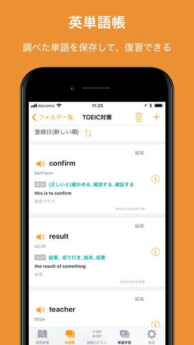 「weblio」は英単語を調べるだけのアプリではありません。検索した単語を、タップ一つで単語帳に入れることが可能です。単語はフォルダに分けて保存することも可能です。