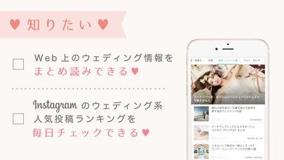 花嫁、そして花婿の知りたい情報が集まっているのが「ウェディングニュース」です。結婚直前の人たちへのインタビューやそれ以外にも役立つ情報が毎日更新されています。日々記事は増えていくので気になった記事がある場合はクリップ機能を使って保存しておくとすぐに読み返すこともできます。Instagramとも連動しており、ウェディング関連の画像をすぐに検索することもできるようになっています。