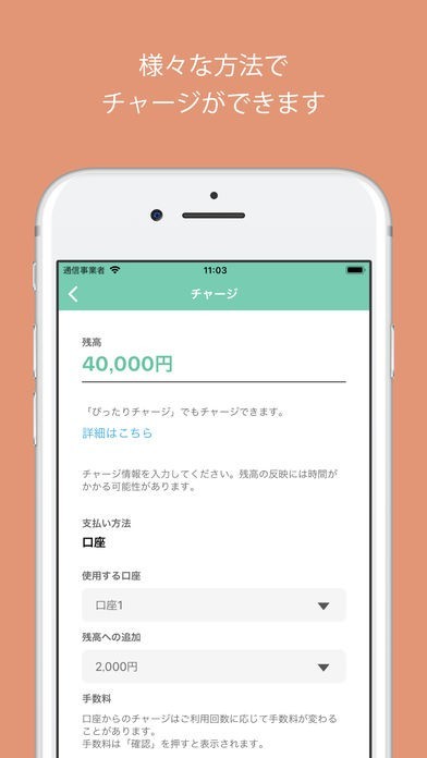 チャージ機能搭載!銀行口座と連携することで支払い金額のチャージが可能!
