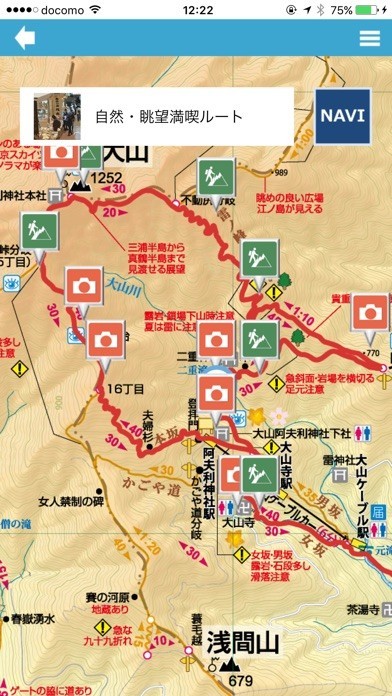 大山地域を散策するおすすめルートを推奨して地図画面とARカメラ画面上で誘導する機能や、画面に浮かぶアイコンをタップして施設詳細を表示する機能、イラストマップを表示してオフラインで誘導する機能などがあります。