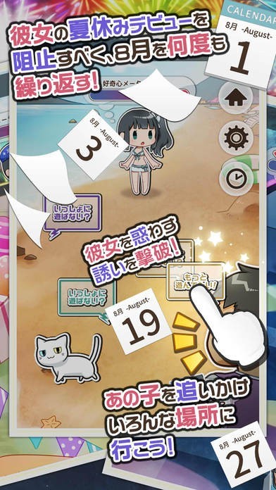 「夏休みデビュー~僕の好きなあの子の場合~」はずっと片思いだった女の子が夏休みを終えるとギャルになってしまうのを防ぐために、何度でも8月を繰り返していく運命を変える恋愛シミュレーションゲームアプリになります。8月の夏休みの間、彼女が夏休みデビューしてしまわないように彼女を追跡して、様々な誘惑をタップしてブロックすることで彼女を守り続けるゲームとなっていて、プレイヤーの選択次第でさまざまな結末を迎えることが出来るマルチエンディングシステムを採用していて、すべてのエンディングを達成することでトゥルーエンドへのルートが解放されるようになっています。