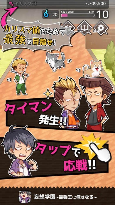 「妄想学園~最強王に俺はなる~」は、学校を舞台にした放置系カジュアルゲームです。プレイヤーは元いじめられっ子の主人公を操作して、世界最強を目指していきましょう。フィールドに出現するキャラクターに接触するとタイマン勝負が発生。ひたすらタップで勝利すれば、カリスマ値を貯めることができます。カリスマ値を貯めることによりランクが上昇。新キャラクターの登場や、中二病感たっぷりのストーリー展開も楽しめます。学校では多彩なイベントも発生。キャラクターのコンプリートなどのやり込み要素も揃い、通勤通学の暇つぶしや、休憩時間の気分転換にも最適なゲームとなっています。