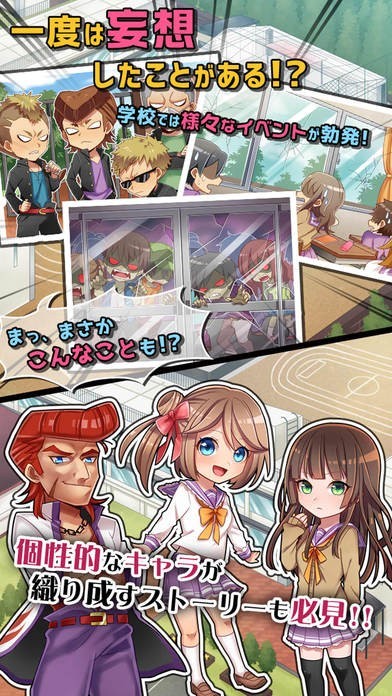 『妄想学園~最強王に俺はなる~【放置】』は「不良のカチコミを撃退して学校のヒーローになる!」や「ゾンビが襲来!オレが1匹残らず倒してやる!」といった誰もが一度は妄想したことがある中二病満載な妄想を舞台にした育成シミュレーションゲームです!ストーリーを進めるたびに主人公が強くなっていき、更に大きな学園の危機を救うことが目的です。可愛く愛着のあるキャラクターが多く登場する点も本アプリの魅力となってます。攻略のキーポイントはスワイプ!敵キャラが出現したらスワイプをして敵を倒していき経験値を稼ごう!可愛いキャラたちと織り成す中二病妄想ストーリーで学園の危機を救いましょう!