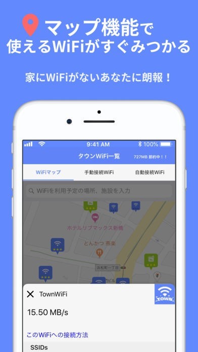 「タウンWiFi」はスマホの通信制限がすぐにかかるという学生の方に便利なアプリです。 街にあるWiFiスポットに自動で接続する機能が付いており、通信量の節約が期待できます。 中にはパスワードが必要なWiFiスポットがありますが、スマホの画面をタップするだけで良いため、パスワードが分からないという時でも大丈夫です。 高画質な動画やオンラインゲームなどを楽しみたい時は早い通信速度のWiFiスポットを選んで接続しておくという使い方ができます。 便利なWiFiスポットがあるけど表示されないという時はリクエストを行っておきます。 リクエストが通ると接続できるようになるのが良い点です。 外国にも対応WiFiスポットがありますので、海外旅行時にも役立つアプリです。