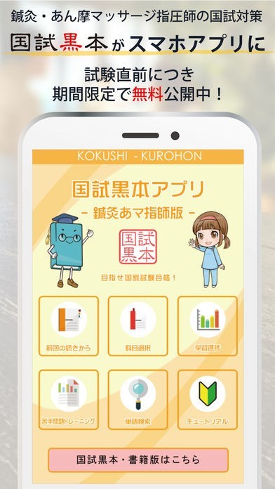 【国試黒本アプリ-鍼灸あん摩マッサージ指圧師版-】は、鍼灸師・あん摩マッサージ指圧師 国家資格試験の受験生のための参考書が学習できるサービスです。