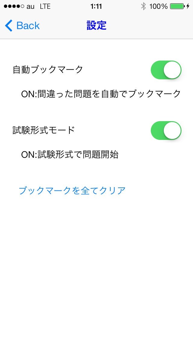 問題を間違えると、自動的に50問までブックマークに登録されます。ブックマークすべてクリアを選択すれば、登録されたブックマーク解除も簡単にできます。ブックマークを上手に利用して復習に利用しましょう。