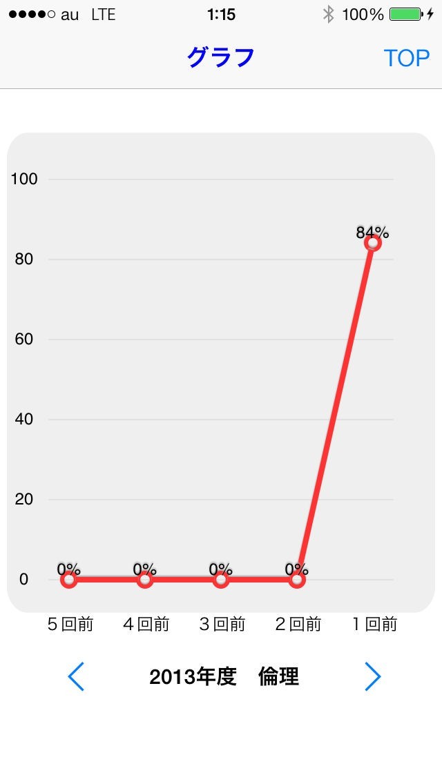 試験形式モードでは問題終了後に試験結果の正解率が表示されるので、自分のレベルを確認することができます。また、過去5回分のグラフを見ることができ、モチベーションアップに繋がります。