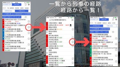 一覧から任意の列車の情報ボタンをタップするとその列車の経路情報一覧が表示されます。また経路情報一覧の任意の駅の更新ボタンをタップするとその到着時間と場所を基準に電車の一覧を表示することができます。