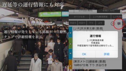 遅延の発生している路線とその路線が通る駅名はピンク色で表示され、吹き出しをタップすることで詳細を知ることができます。