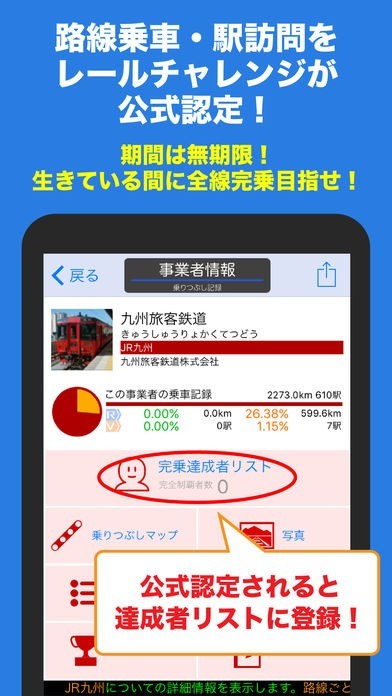 レールチャレンジは日本の鉄道路線の乗りつぶしをサポートするもので、乗った列車から路線の記録が可能で複数の路線も同時に記録できるようになっています。また、乗車キロ、利用駅、完乗率を知ることができます。