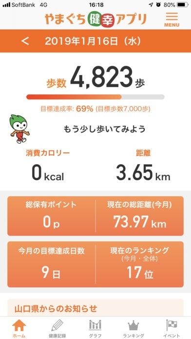App Storeより引用毎日歩いて山口健康ポイントが貯まる、山口県公式ウォーキングアプリです。