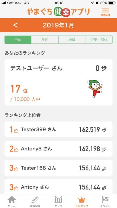 歩数・距離の計測/消費カロリーの表示/健康記録(体重・血圧・健康状態・健診受診)/BMI表示/月間の距離・歩数・消費カロリー・体重のグラフを表示/個人ランキング(全体・年代・地域・企業団体)/グループランキング(地域・企業団体)/各種イベント参加確認(QR読取り)/ウォーキングコース/山口県からのお知らせ配信/アンケート配布/引継ぎ機能/「特典カード」表示/問い合わせ