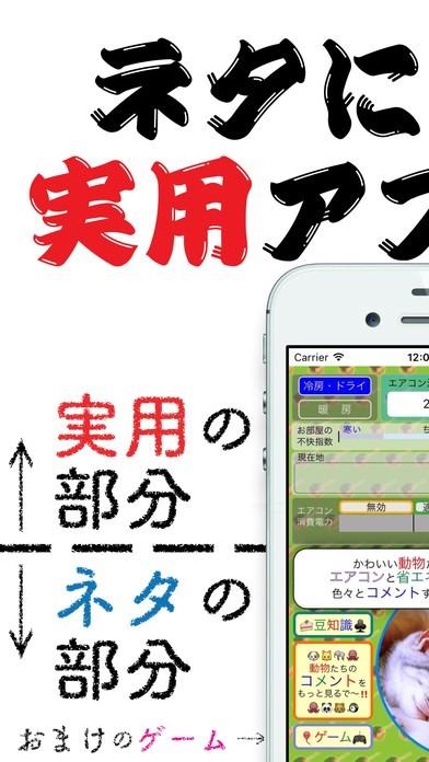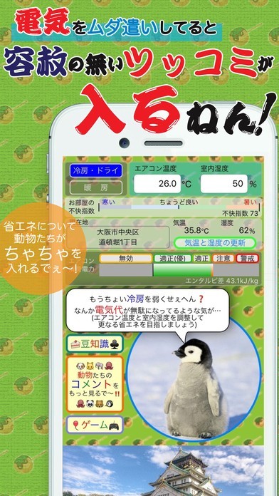 App Storeより引用●動物たちが大阪弁でエアコンの省エネを手助けする、コテコテなアプリの登場です!