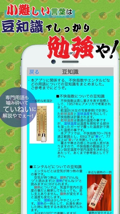 免責事項1:不快指数による暑さ・寒さの判断はあくまで参考にしてください。暑さ・寒さの感じ方は個人差がある為、本アプリでの暑さ・寒さの判定が体感と一致していなくても責任は負いかねます。