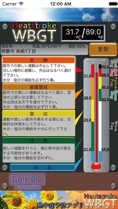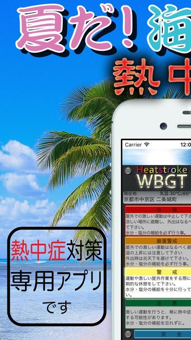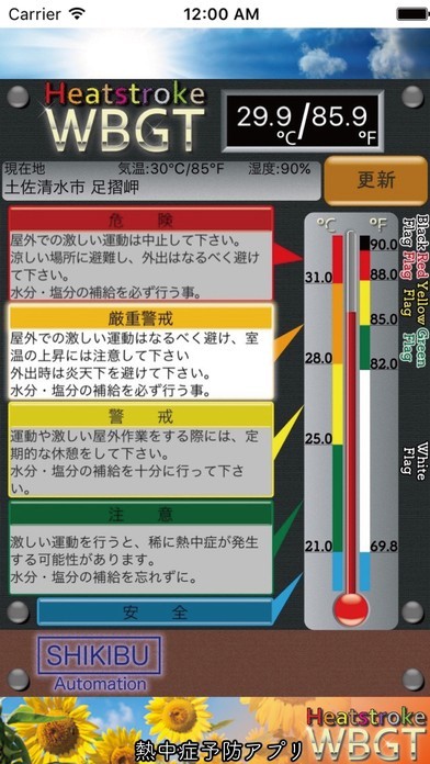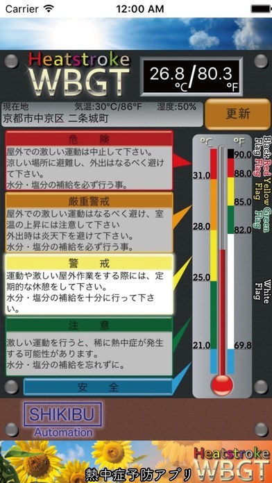 暑さ指数のWBGTをもとに熱中症の危険を知らせてくれるアプリで、端末の使用者だけでなく家族やスポーツチームなどの体調管理にも役立てることが可能です。危険度の判定以外に対処方法の解説がその場で閲覧できるため、熱中症の知識に自信がない人でも安心といえます。また、日本では一般的な摂氏のほか、アメリカ基準の華氏でも確認できますので、海外在住や観光で訪れる旅行者にも対応可能です。