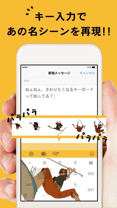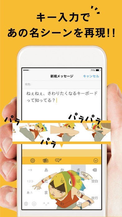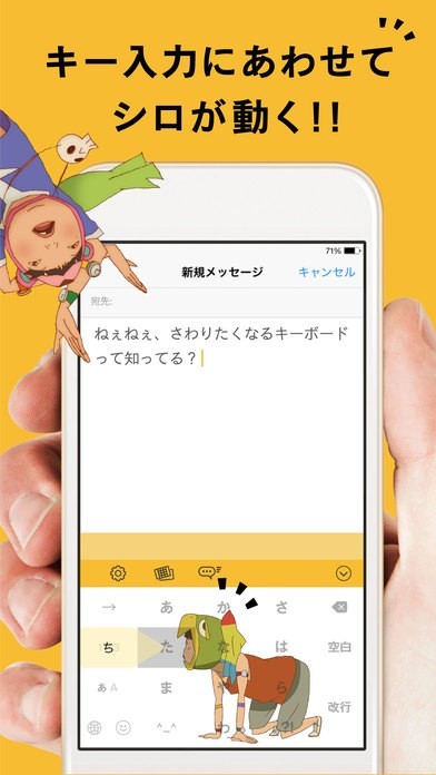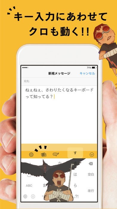 キーボード画面に鉄コン筋クリートのキャラクターが現れます。キーボードをタッチするたびに少しずつ動くので押すたびにパラパラマンガのようになり思わず触ってしまいます。