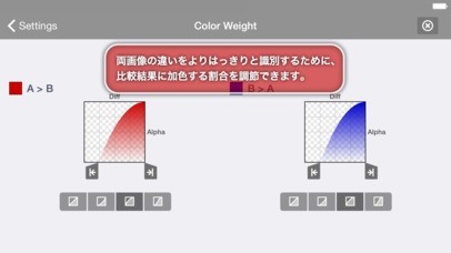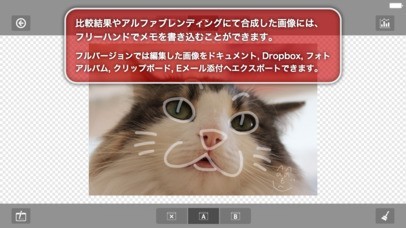 「Pixel Comp」は、画像の比較が行える便利ツールです。メインとなる比較機能では2枚の画像の読み込みが可能。それぞれのピクセルをRGB単位で比較し、その結果をグラフなどで判りやすく表示してくれます。人の目では感知するのも難しいピクセル単位での見分けが行えるため、一見するとまったく同じに見える画像を比較したり、加工後と加工前の写真を見比べる際にも役立ってくれるでしょう。フリーハンドによるメモ機能も用意。画面を指先でなぞるだけで、ちょっとした注釈やメモを付け加えることができます。また、画像の合成機能も搭載。アルファブレンディングによる合成が可能となっており、合成結果によって元画像の差異を比べることもできます。