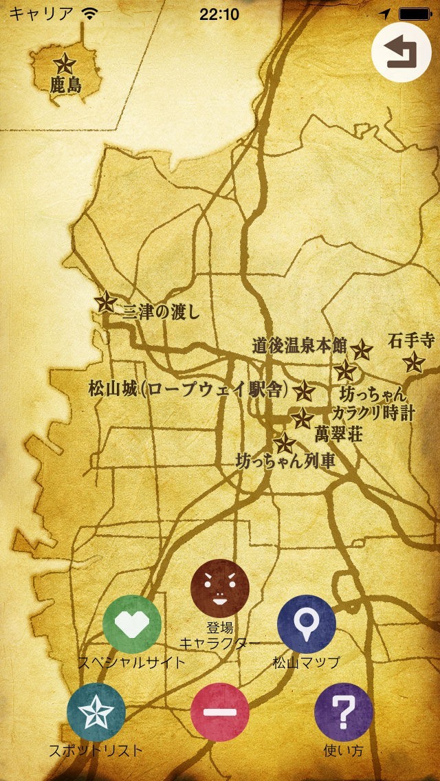 地図上に表示された松山名所に行くと、星マークが回りながら光り出すので、その星マークをタップ!