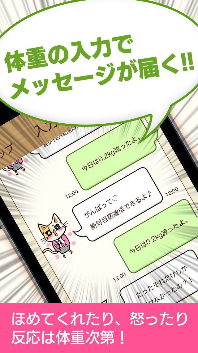 誰かと一緒にダイエットをした方が続きますよね。でも、自分の体重を詳細に言いたくない。そんなあなたにオススメ!毎日体重を記録すると、3人の個性的キャラ達から返信がくる。必ずやる気が持続します。